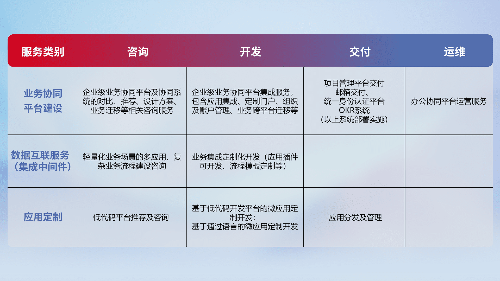 针对钉钉、、、、企微、、、IDaas等平台级产品提供产品的规划、、、、方案、、、交付、、、定制化开发等服务,,,,实现如统一协同办公、、、、智能客户服务、、、、混合会议管理、、、智能数据查询、、、等业务场景,,,,实现数字化转型。。。